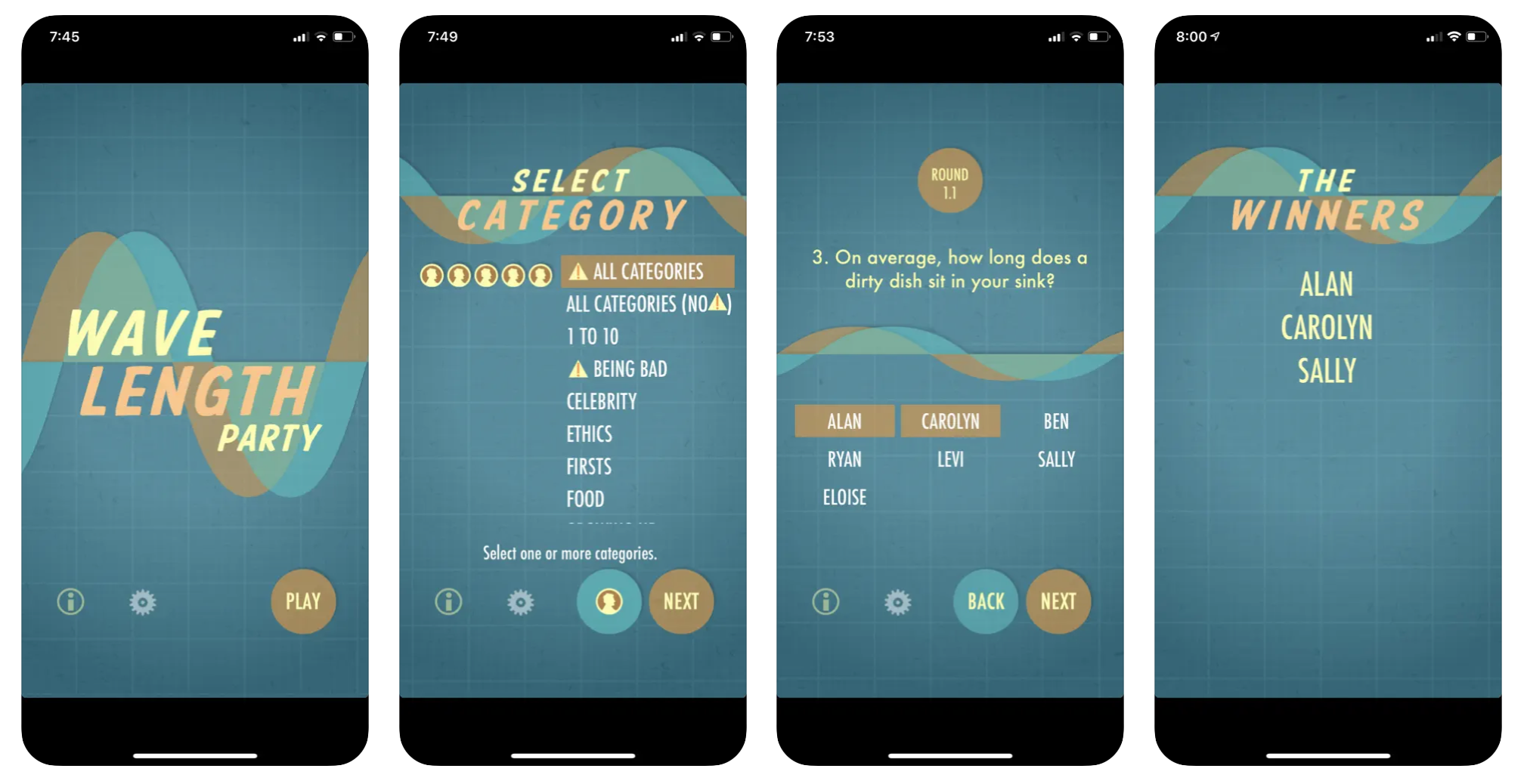Several years back, I invented a party game called Wavelength Party (not to be confused with another different game also called Wavelength that came out years later…grrr). A friend of mine and I turned my game into an app. For the app, in addition to co-creating the content, I did all the design work myself (and even did the sound design). You can download the game for free on the iPhone app store here.